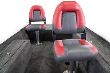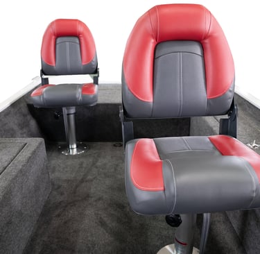 The Bass 420TS (tiller steer) has a side positioned long rod locker and seats on pedestals. The Bass 420SC is the side console version. Both feature a rear and forward casting decks.